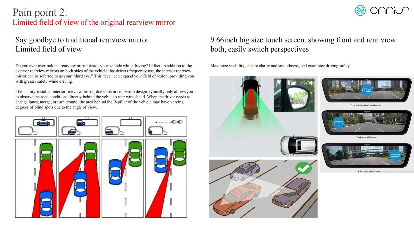 Narrow Field of View – The traditional mirror only reflects what’s directly behind you, leaving dangerous blind spots.